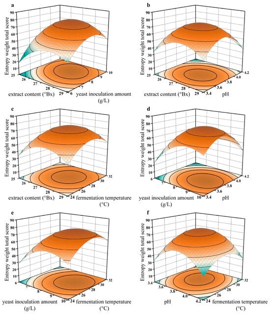 Two-way interaction of extract content: (a) extract content and yeast inoculation amount, (b) extract content and pH, (c) extract content and fermentation temperature, (d) yeast inoculation amount and pH, (e) yeast inoculation amount and fermentation temperature, (f) pH and fermentation temperature.