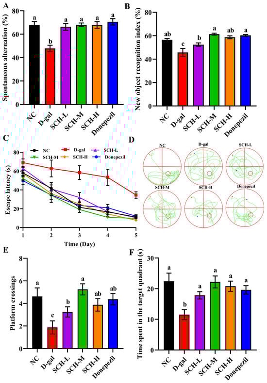 Effects of sea cucumber hydrolysates on cognitive behaviors in aging mice. (A) Spontaneous alternation in Y maze test. (B) Recognition index in new object recognition test. (C) Escape latency during training stage, (D) representative trajectory, (E) platform crossings number, and (F) time on target quadrant in space exploration test of Morris water maze. Letters correspond to significant difference (p < 0.05) (n = 8–10). SCH-L/M/H: low/medium/high-dose sea cucumber hydrolysates.