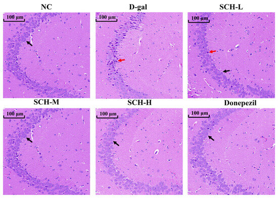 In the NC group, hippocampal neurons exhibited dense populations with well-organized spatial arrangements (black arrows). Neuronal cytoarchitecture remained intact, displaying distinct cellular outlines and uniform nuclear staining intensity. While the D-gal group demonstrated the reduced number of hippocampal neurons, characterized by a loose arrangement, shrunken cells with irregular shapes, and hyperchromatic staining (red arrows). Compared to the D-gal group, SCH-L, SCH-M, SCH-H, and donepezil groups showed the elevated number of hippocampal neurons. Concomitantly, there was a more orderly arrangement and regular morphology, with less hyperchromatic staining (Figure 3).