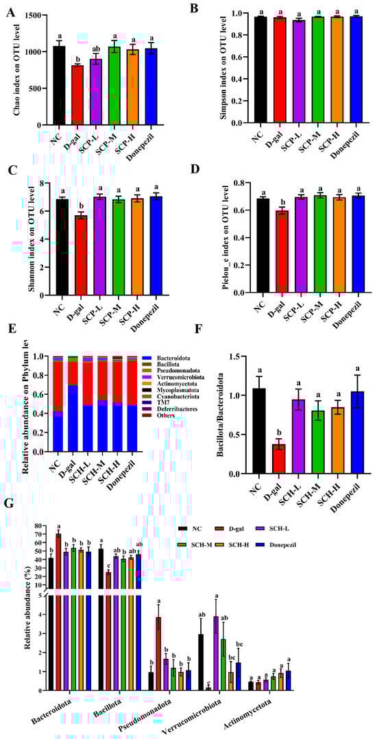 Community richness was calculated using the Chao index, diversity was measured via Shannon and Simpson indexes, and evenness was measured by the Pielou_e index, as shown in Figure 4A–D. The Chao, Shannon, and Pielou_e indexes were lower in the D-gal group than the NC group. Nevertheless, different doses of SCH and donepezil supplementations increased the Shannon and Pielou_e indices, with the SCH-M, SCH-H, and donepezil groups normalizing the Chao index. However, the Simpson index did not differ among these groups.