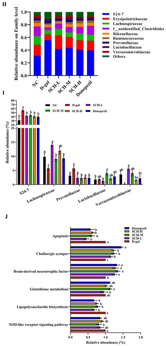 At the Phylum-level, compared to the NC group, the D-gal group had lower Bacillota/Bacteroidota ratio and levels of Bacillota and Verrucomicrobia. Nevertheless, it had higher relative levels of Bacteroidota and Pseudomonadota. SCH and donepezil supplementations increased relative levels of Bacillota and the Bacillota/Bacteroidota ratio, but reduced relative levels of Bacteroidota and Pseudomonadota. Nevertheless, the effect of donepezil on Verrucomicrobiota was not significantly difference compared to that of D-gal group (Figure 4E–G). At the family-level, the D-gal group showed lower relative levels of Lachnospiraceae and Verrucomicrobiaceae, while it showed higher relative levels of Muribaculaceae (S24-7) and Prevotellaceae. SCH and donepezil supplementation reduced relative levels of S24-7 and Prevotellaceae, whereas SCH and donepezil supplementations increased relative levels of Lachnospiraceae. Moreover, SCH-L and SCH-M elevated the abundance of Verrucomicrobiaceae at the family level. Notably, donepezil showed limited effects on increasing the abundance of Verrucomicrobiaceae compared to SCH-L and SCH-M groups (Figure 4H,I).