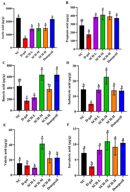 The D-gal group exhibited significant reductions in fecal levels of isovaleric acid, acetic acid, and butyric acid. However, SCH-L, SCH-M, SCH-H, and donepezil supplementations increased fecal acetic acid and isovaleric acid levels compared to the D-gal group. Notably, both the medium dose of SCH and donepezil supplementations increased levels of butyric acid level in feces. Furthermore, the medium dose of SCH led to an increased fecal valeric acid level, while varying doses of SCH supplementation resulted in elevated propionic acid levels (Figure 5).