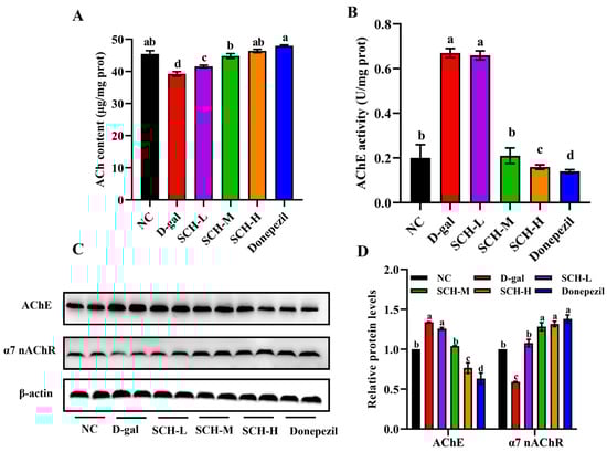 Sea cucumber hydrolysates supplementation ameliorated cholinergic dysfunction in aging mice. (A) ACh contents and (B) AChE activity in hippocampus. (C) Protein expression levels of AChE and α7 nAChR in hippocampus and (D) quantification data. Letters correspond to significant difference (p < 0.05) (n = 6). SCH-L/M/H: low/medium/high-dose sea cucumber hydrolysates; ACh: acetylcholine, α7 nAChR: α7 nicotinic ACh receptor, AChE: acetylcholinesterase.