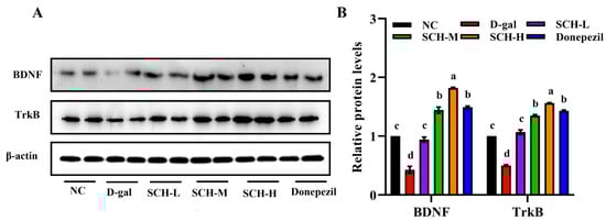 The hippocampal protein levels of BDNF and TrkB were decreased in the D-gal group. However, intervention with different doses of SCH dose-dependently elevated hippocampal protein levels of BDNF and TrkB the D-gal group. Similarly, the donepezil group showed elevated protein levels of BDNF and TrkB relative to the D-gal group, while the effect was not superior to the high dose of SCH (Figure 7).