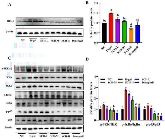 The D-gal group exhibited the increased hippocampal protein expression of IBA-1 compared to the NC group, indicating enhanced microglial reactivity Nevertheless, SCH and donepezil supplementations decreased protein levels of IBA-1 compared to the D-gal group (Figure 8A,B). The hippocampal protein levels of p-IKK/IKK, p-IκBα/IκBα, and p-p65/p65 were elevated in the D-gal group compared to that in the NC group. Nevertheless, the expression of p-IKK/IKK, p-p65/p65, and p-IκBα/IκBα was reduced after SCH supplementations at different doses, with a similar decrease observed following donepezil supplementation, and the effect was better than that of the low- and medium-dose SCH groups, but comparable to that of the high-dose group (Figure 8C,D).