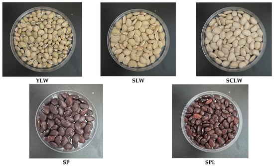 In this study, the following Chinese varieties of hyacinth bean were used: white hyacinth bean (chongming white hyacinth bean); two red hyacinth bean varieties (Jiading Zhuxuebian and Pudong red hyacinth bean) from Shanghai; white hyacinth bean from Chongxiong, Yunnan Province; and white hyacinth bean from Chengdu, Sichuan Province (Table S1, Figure 1). These hyacinth beans were collected from local planting areas using the five-point sampling method, with a total of 500 g sampled for each variety. Before the analysis, the hyacinth bean samples were freeze-dried and ground into powder. The powder was stored at −80 °C until the metabolomic analysis.