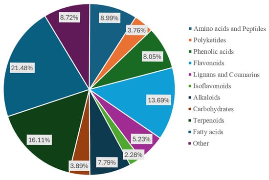 We used a non-targeted metabolomics analysis method based on UHPLC-QE HF HRMS to conduct metabolomics analysis on hyacinth bean seeds from five local varieties (designated as YLW, SLW, SCLW, SLP, and SP). The identification results were annotated according to the Metabolomics Standards Initiative (MSI) [] to determine the level of the metabolites identified. A total of 33,802 metabolites were detected in the five hyacinth bean varieties (Table S2); of these, 423 metabolites were identified as level 1, and 322 metabolites were identified as level 2. The 745 metabolites identified were classified into 11 categories, including phenolic acids (8.05%, 34 at level 1), flavonoids (13.69%, 56 at level 1), fatty acids (21.48%, 117 at level 1), amino acids and their derivatives (8.99%, 28 at level 1), alkaloids (7.79%, 25 at level 1), carbohydrates (3.89%, 27 at level 1), lignans and coumarins (5.23%, 19 at level 1), terpenes (16.11%, 25 at level 1), polyketides (3.76%, 19 at level 1), and others (8.72%, 26 at level 1) (Figure 2). Therefore, flavonoids, terpenes, and fatty acids are the main metabolites in hyacinth bean seeds.