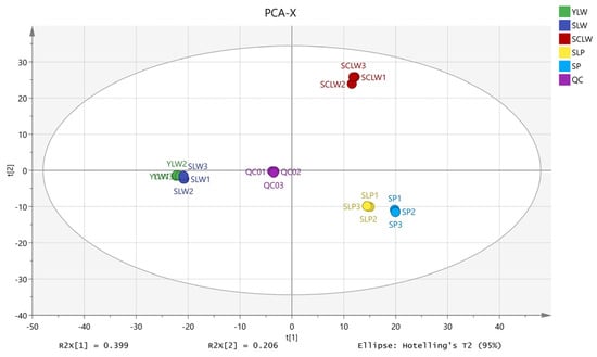 Principal component analysis (PCA) is helpful for understanding the overall metabolic differences between different groups and the degree of variation between samples within the same group []. Here, the R2X (cum) of the PCA model was 0.920 and the Q2 (cum) was 0.864 (Figure 3), indicating that the model performed well. The five hyacinth bean varieties have independent regions on the PCA score plot, indicating that there are differences in their metabolite profiles. As shown in Figure 2, the five hyacinth bean varieties are distributed in three regions. Among them, SCLW is located on the bottom right, SLP and SP are located on the top right, and the white hyacinth beans from Yunnan (YLW) and Sichuan (SLW) are located on the left. These results show that the metabolite profiles vary not only according to the different seed coat colors but also depending on the geographical origin. Studies on sesame [], rice [], and quinoa [] have all reported similar conclusions, indicating that both genetic factors and environmental differences can influence the metabolic profiles of plants. In this study, SCLW, YLW, and SLW are white hyacinth beans. SCLW comes from Chongming District, Shanghai, which has a significantly lower altitude than Sichuan and Yunnan. The climate of the three regions is also different. The impact of the environment on plant metabolites is a complex process, and more experiments are required to elucidate the degree of influence that different environmental factors may exert.