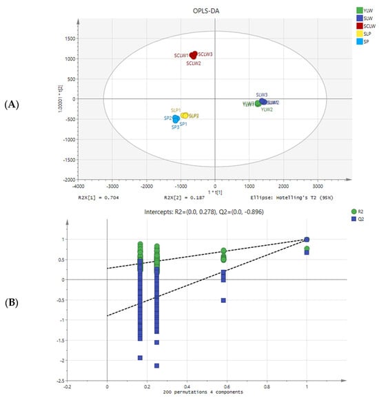 In this study, OPLS-DA and ANOVA were used to identify the differences in metabolites between hyacinth bean varieties. In the OPLS-DA score plot, the distribution of the five hyacinth bean varieties was similar to PCR analysis, with R2 x cum, R2 y cum, and Q2 cum values of 0.987, 0.996, and 0.987, respectively (Figure 4A). Then, 200 permutation tests were conducted to determine whether the supervised OPLS-DA model was overfitting. The original points of R2 and Q2 on the right are higher than the values of R2 and Q2 arranged on the left, indicating that the OPLS-DA model is reliable (Figure 4B) []. p-value < 0.05 and a variable importance projection (VIP) ≥ 1 were used as the criteria to screen for significantly different metabolites in pairwise comparisons. There were 175 significantly different metabolites (110 of them upregulated) in YLW vs. SLW; 380 (165 upregulated) in YLW vs. SCLW; 352 (172 upregulated) in YLW vs. SLP; 395 (168 upregulated) in YLW vs. SP; 389 (141 upregulated) in SLW vs. SCLW; 376 (163 upregulated) in SLW vs. SLP; 396 (153 upregulated) in SLW vs. SP; 269 (179 upregulated) in SCLW vs. SLP; 266 (148 upregulated) in SCLW vs. SP; and 94 (24 upregulated) in SLP vs. SP (Table 1).