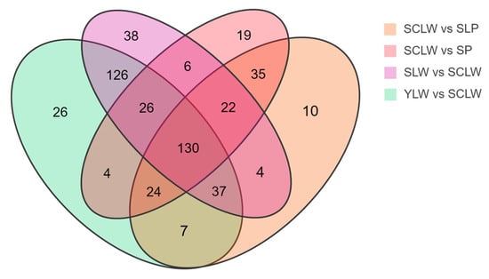 In the PCA and OPLS-DA score plots, SCLW is distributed in independent regions and is significantly distinguished from the other four varieties. We constructed a Venn diagram of the differential metabolites in SCLW vs. SLP, SCLW vs. SP, SCLW vs. YLW, and SCLW vs. SLW (Figure 5). There are 130 significantly overlapping different metabolites in these four pairwise comparisons, among which the number of upregulated metabolites in SCLW is about twice that of downregulated metabolites. In the comparisons of SCLW vs. SLP and SCLW vs. SP, there were 50 and 62 metabolites, respectively, with fold changes greater than 10. These metabolites were mainly flavonoids, phenolic acids, lignans, coumarins, and terpenes, among which there were 36 overlapping metabolites (14 of which were upregulated) (Table S3). The downregulated metabolites were mainly flavonoids related to anthocyanin metabolism. Ginsenoside Ro, glycitin, and ghikusetsaponin IVa, which are common and have been identified as biologically active metabolites in legumes [], were significantly upregulated in SCLW. In the comparisons of SCLW vs. YLW and SCLW vs. SLW, there were 101 and 107 metabolites, respectively, with fold changes greater than 10. These metabolites were mainly flavonoids, phenolic acids, alkaloids, and terpenes, and 73 (47 upregulated) were overlapping (Table S4). The upregulated substances were mainly flavonoids, and others were bioactive metabolites commonly identified in leguminous plants, such as glycitin, soyasaponin Ba, and ginsenoside Ro []. These results show that Chongming white hyacinth bean seeds have a higher medicinal value than the seeds of other local hyacinth bean varieties.