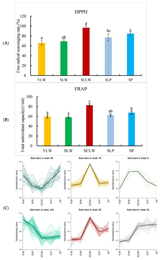 The K-mean clustering analysis of different metabolites and antioxidant activities of the different hyacinth bean varieties seeds. (A) DPPH free radical scavenging rate of the five hyacinth bean seeds (%); (B) FRAP, ferric reducing antioxidant potential (U/mL); (C) K-mean clustering analysis of different metabolites in YLW, SLW, SCLW, SPL, and SP. Note: Lowercase letters indicate significant differences, p < 0.05.