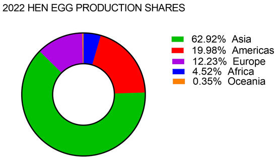 Global egg production has grown steadily over the last decades. The most recent data on global egg production from FAO (Food and Agriculture Organization of the United Nations) estimate that a total of 8.70 × 107 tons (t) of HEs were produced in the world in 2022, with 6.42 × 107 t in 2010, and 5.12 × 107 t in 2000 (source: FAOSTAT Crops and livestock production data, available at http://www.fao.org/faostat (accessed on 3 and 17 March 2025). Asia accounted for almost 63% of total egg production in 2022, followed by the Americas at 20% and Europe at 12% of production shares (Figure 1).