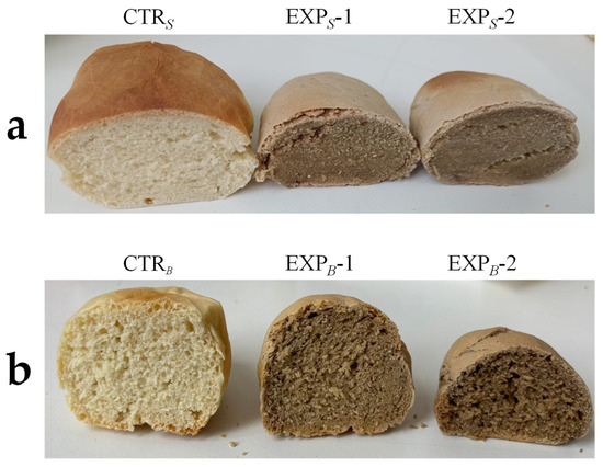 Breads processed with OOMW. (a) S process breads, produced using exclusively sourdough as fermentation agent. Abbreviations: CTRS, control production; EXPS-1, experimental 1 production (50% OOMW in substitution of water); EXPS-2, experimental 2 production (100% OOMW in substitution of water). (b) B process breads, produced using a biga-like fermentation agent. Abbreviations: CTRB, control production; EXPB-1, experimental 1 production (50% OOMW in substitution of water); EXPB-2, experimental 2 production (100% OOMW in substitution of water).
