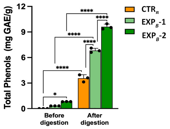 Total phenol released from B process breads before and after in vitro digestion. Values are the mean ± SD n = 3 experiments. * p < 0.05; **** p < 0.0001 (ANOVA associated with Tukey’s test). Abbreviations: CTRB, control production; EXPB-1, experimental 1 production (50% OOMW in substitution of water); EXPB-2, experimental 2 production (100% OOMW in substitution of water).