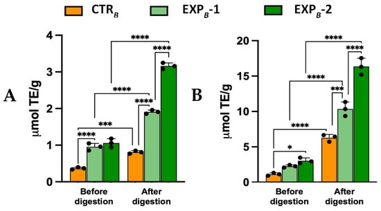 The DPPH decoloration assay revealed 2.5-fold and 1.8-fold higher activities in the EXPB-1 and EXPB-2 breads vs. the CTRB bread, increasing their radical scavenging capacity by, respectively, before digestion (Figure 4A). Post-digestion values reached 1.91 ± 0.11 and 3.16 ± 0.28 μmol TE/g in EXPB-1 and EXPB-2 breads, respectively, which is 2.4-fold and 3.9-fold higher than CTRB bread (Figure 4A). Similar results were obtained using the ABTS•+ decolorization assay (Figure 4B). These findings demonstrate that the digestion process of bread fortified with OOMW facilitates the release of active compounds in the digested fraction, thereby enhancing the antioxidant potential of the product and improving its functional health properties.