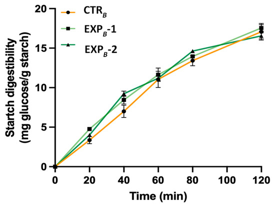 Starch digestibility during in vitro intestinal digestion of B process breads. Data are the mean ± SD of n = 3 experiments. (ANOVA associated with Tukey’s test). Abbreviations: CTRB, control production; EXPB-1, experimental 1 production (50% OOMW in substitution of water); EXPB-2, experimental 2 production (100% OOMW in substitution of water).