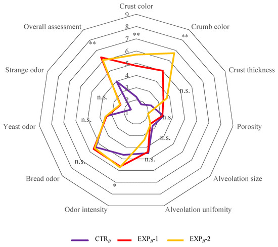 Spider diagrams of descriptive sensory analysis of B process breads. Abbreviations: CTRB, control production; EXPB-1, experimental 1 production (50% OOMW in substitution of water); EXPB-2, experimental 2 production (100% OOMW in substitution of water). *, p < 0.01; **, p < 0.001; n.s., not significant.