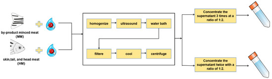 The procedure for the extraction of WSTS was conducted via the technique outlined by Zhou and Wang [13]. Samples and ultrapure water were combined at a 1:2 (g/mL) ratio and then homogenized for 30 s. The blend was then subjected to 10 min of ultrasound before being immersed in a water bath maintained at 100 °C for a duration of 2 h. Following this, the mixtures were carefully filtered using a Whatman No. 54 filter membrane to ensure purity. The filtered solutions obtained were allowed to cool and subsequently centrifuged (10,621× g, 20 min, 4 °C). The clear liquid gathered above the residue, referred to as the supernatant, was then isolated and concentrated. This concentrated solution represents the water-soluble taste substances. The concentration process followed a 1:2 (g/mL) ratio with the original filtrate. The MM and HM groups refer to the substances concentrated three and two times, respectively (as depicted in Figure 1). As shown in our previous study [13], these conditions yield umami amino acid contents similar to that in the original unextracted sample.