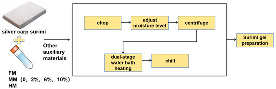 Fresh fish (P. crocea) was sourced from Qimin Agriculture and industry Co., Ltd., Ningde, China. The FM was finely ground before application. MM was extracted from the skin and tail, while the meat from the fish head yielded HM. Commercially available frozen silver carp surimi (AAA grade, Hubei Meister Food Co., Ltd., Jingzhou, China, possessing 75.65% moisture, 14.26% protein, and 0.49% fat content) was utilized as the surimi input. This frozen surimi was segmented into roughly 500 g units, vacuum-packaged, sealed, and kept at −20 °C until required.