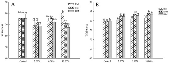 Analysis of reconstituted surimi and surimi gel whiteness. Note: Mean values of six replicates and standard deviation. (A) Surimi sample. (B) Surimi gel sample. FM: large yellow croaker muscle. MM: water-soluble substance concentrated three times from fish skin and fish tail minced meat. HM: the water-soluble substance concentrated two times from fish head meat. a–c indicate significant differences among the additions of same additive (p < 0.05) according to Duncan’s test. A–C indicate significant differences among the additives at the same addition (p < 0.05) according to Duncan’s test. The same is shown below.
