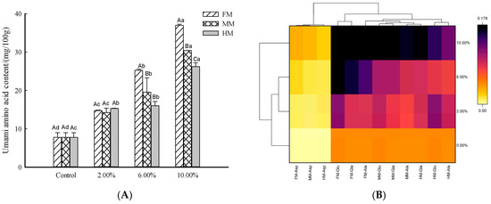 Effects of processing by-products on umami amino acid content in reconstituted surimi gels: bar chart (A) and heatmap (B). Note: a–c indicate significant differences among the additions of the same additive (p < 0.05) according to Duncan’s test. A–C indicate significant differences among the additives at the same quantity (p < 0.05) according to Duncan’s test.