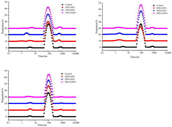 Low-field nuclear magnetic resonance technology (LF-NMR) is a widely adopted and efficient method for rapidly conducting non-destructive analyses of water distribution and migration within food samples. Its application in the field enables researchers to gain valuable insights into the behavior of water in food matrices. The fitted transverse relaxation time (T2) serves as a valuable metric for understanding water mobility and water–protein interactions within the surimi gels. Simultaneously, the area under the curve in the T2 spectrum offers valuable insights into the quantity of water present within each gel component [21,22,23,24,25,26,27,28,29].