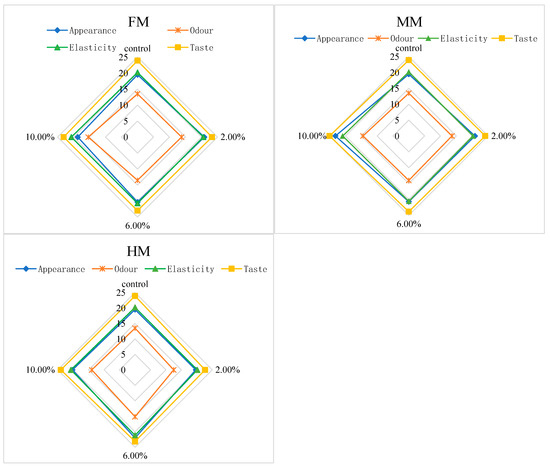 Based on the sensory scores of each index in the FM group, the overall appearance and mouthfeel achieved the highest scores of 20.90 and 23.30, respectively, at an addition level of 2.00%. When the addition level reached 10.00%, the odor score of the surimi gel in the FM group peaked at 15.40, while no significant differences were observed in elasticity among groups. Combining the total sensory scores of the FM group in Figure 7, we see that the surimi gel reached the optimal overall sensory values at 2.00% addition, with a total score of 78.60. This phenomenon can be attributed to the fact that higher addition levels increased the hardness and chewiness of the surimi gel. For the same chewing time, the release of overall flavor and the texture properties of surimi products were relatively reduced, leading to lower total sensory scores. The sensory evaluations of the MM and HM groups were conducted using the 2.00% FM group as the reference standard. For the MM group, the highest scores for appearance, odor, elasticity, and mouthfeel (23.14, 14.43, 20.86, and 25.00, respectively) were obtained at an addition level of 10.00%, resulting in the highest total sensory score of 83.43. In the HM group, the highest scores for appearance, odor, and elasticity (22.00, 15.14, and 21.14, respectively) were observed at 6.00% addition, while the highest mouthfeel score occurred at 10.00%. However, as shown in Figure 7, the highest total sensory score for the HM group was 81.43 at 6.00% addition.