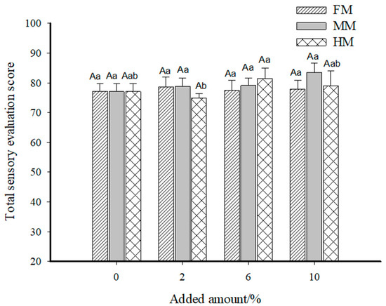 Total sensory scores of the reconstituted surimi gel. Note: a–b indicate significant differences among the additions of the same additive (p < 0.05) according to Duncan’s test. A indicates significant differences among the additives at the same quantity (p < 0.05) according to Duncan’s test.