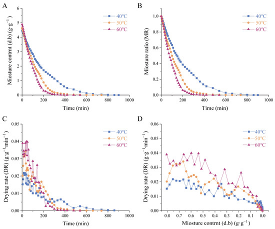 Drying kinetic curves of Houttuynia cordata Thunb. (A) dry basis moisture content of HCT, (B) moisture ratio curve of HCT. (C) drying rate with the wet basis moisture content of the curve, (D) drying rate curves of HCT at different drying temperatures. 40 °C/50 °C/60 °C: hot-air drying at 40 °C, 50 °C, and 60 °C HCT respectively.