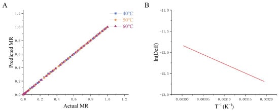 Relationship between hot-air thin-layer drying temperature and effective diffusion coefficient of Houttuynia cordata Thunb. drying by hot air. (A) The predicted MR by the Aghabashlo model vs. Actual MR, (B) Arrhenius type relationship between effective diffusivity and temperature. 40 °C/50 °C/60 °C: hot-air drying at 40 °C, 50 °C, and 60 °C HCT respectively.