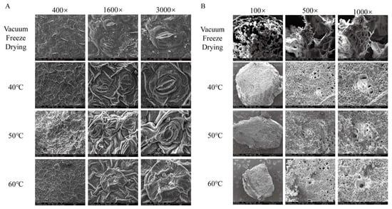 Microstructure diagrams of Houttuynia cordata Thunb. (A) Houttuynia cordata Thunb. Leaves, (B) Houttuynia cordata Thunb. Stems were dried under vacuum freeze-drying conditions (freeze-drying sample) at 40 °C hot-air drying, 50 °C hot-air drying, and 60 °C hot-air drying. 100×: 100 times magnification, 400×: 400 times magnification, 1600×: 1600 times magnification, 3000×: 3000 times magnification.