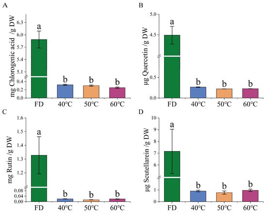Determination of Houttuynia cordata Thunb. content in freeze-drying (FD), 40 °C hot-air drying HCT extracts (40 °C), 50 °C hot-air drying HCT extracts (50 °C) and 60 °C hot-air drying HCT extracts (60 °C), (n = 3). (A) chlorogenic acid, (B) quercetin, (C) rutin, and (D) scutellarin. Groups without common letters are significantly different (p ≤ 0.05).