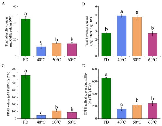 Phytochemical contents and antioxidant activities in Houttuynia cordata Thunb. extracts under different drying conditions (n = 6). (A) Total phenolic content; (B) total flavonoid content; (C) antioxidant capacity of FRAP; (D) DPPH scavenging capacity. FD: freeze-drying; 40 °C, 50 °C, 60 °C: hot-air drying at 40 °C, 50 °C, and 60 °C respectively. Values without common letters indicate significant differences (p ≤ 0.05).
