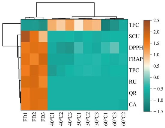 Heatmap visualization. Rows represent bioactive compounds (TFC, SCU, DPPH, FRAP, TPC, RU, QR, CA), while columns represent samples grouped by processing methods (FD: freeze-drying HCT; 40 °C/50 °C/60 °C: hot-air drying at 40 °C, 50 °C, and 60 °C HCT respectively). Data are normalized by row Z-scores (color scale: brown = high abundance [2.5], green = low abundance [−1.5]).
