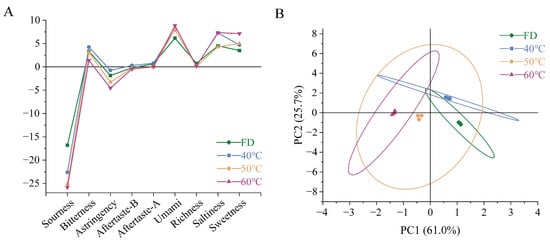 The Insent SA402B Taste Sensing System (INSENT TS-5000Z, Atsugi-shi, Japan) is also known in the sensory analysis world as an electronic tongue. This particular electronic tongue is composed of a group of individual sensors that contain proprietary lipid and polymer membranes that mimic living organisms. Compared with other electronic tongues in the industry, it can measure the sourness, saltiness, bitterness, astringency, umami, sweetness, and aftertaste of bitterness, astringency, umami, producing a set of data that is completely unbiased [31]. The method of e-tongue measurement was used, as shown in the study [32]. All analyses were performed in triplicate (n = 3).