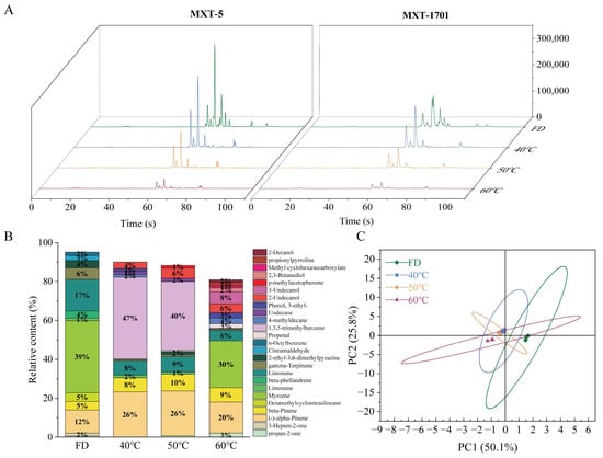 Total ion chromatograms of HCT Thunb. (HCT) ethanol extracts obtained by different drying methods: (A) freeze-dried, (B) 40 °C hot air thin layer drying, (C) 50 °C hot-air thin-layer drying, and (D) 60 °C hot-air thin-layer drying.