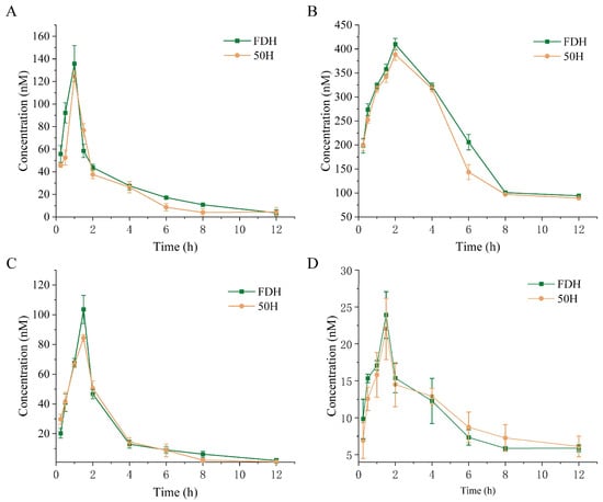 The animal study protocol was approved by the Animal Ethics Committee of Jiangxi University of Chinese Medicine (Approval No. TEMPOR20230112). A total of 24 female SD rats (200 ± 20 g) were obtained from the Laboratory Animal Center of Jiangxi University of Chinese Medicine (Nanchang, China). Prior to experimentation, the rats were acclimated for 7 days in an air-conditioned room maintained at 24 ± 1 °C with a 12 h light/dark cycle. After one week of acclimatization with ad libitum access to sterilized food and water, the rats were randomly divided into three groups (n = 8), including a negative control, FDH: freeze-dried HCT extract (treated with 600 mg/kg BW freeze-dried HCT extracts), 50H: 50 °C hot-air dried HCT extract (treated with 600 mg/kg BW 50 °C hot-air dried HCT extracts). Blood collection and the pretreatment of serum were conducted following our previously published protocols [30]. The identification and quantification of metabolites in rat samples were performed using analytical methodologies consistent with those employed in our previous investigations [37].