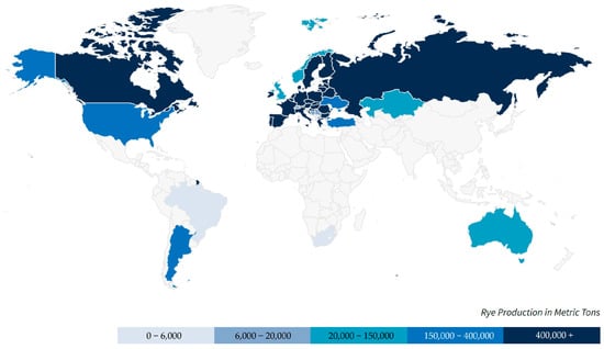 Rye (Secale cereale L.) has a long, widespread history of cultivation. It originated in around 6600 BCE as a weed species infesting mostly wheat and barley, and was domesticated in around 1800–1500 BCE. The first areas of cultivation were Asia, and Eastern and Central Europe. During the Middle Ages, it became a primary bread crop in multiple areas, particularly those characterized by poor soils and a cold climate [,,]. According to USDA data [], global production of rye was 10.6 million tons, with the majority of production located in the European Union (65%) [] (Figure 1). Globally, in 2023, Germany was the largest producer of rye with 3.1 mln tons harvested, followed by Poland with 2.5 mln tons []. Globally, the production of rye grain is decreasing slightly (by approximately 1% annually). However, there are countries, such as Germany and Poland, where both the area of cultivation and production are increasing []. For example, in 2019, the area of land sown to rye was 904,000 hectares, representing a 179 thousand-hectare increase since 2015 [].