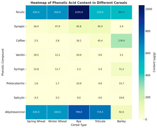 Heatmap of the phenolic acid content in different cereals. Source: [,,,,,,,,,,,,,,,,,,].