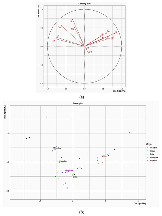 PCA score plot (a) and loading plot (b) of the trace metals and metalloids loadings (vectors) and the individual scores of PC1 and PC2 according to the honey types examined.