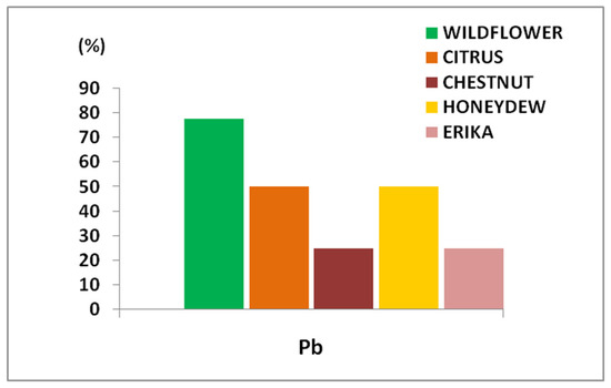 Distribution (%) of Pb content in honey samples of different floral origin.