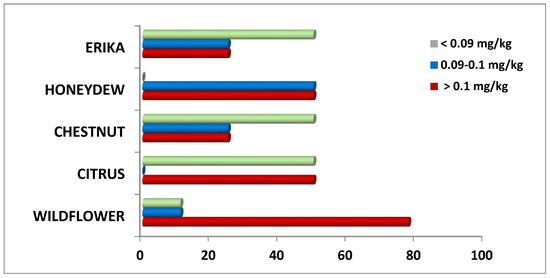 In more detail, considering the distribution of Pb content in these honey samples, it is possible to observe some important differences (Figure 3). Specifically, 80% of Wildflower samples exceeded the MRL, followed by 50% of Citrus and Honeydew samples, and 25% of Erika and Chestnut samples. Therefore, Wildflower honey resulted in the most contamination while Erika and Chestnut the least.
