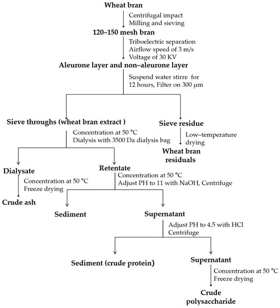 The preparation of the samples for this study included three main steps. First, the aleurone (AL)-rich fraction and non-aleurone-rich fractions were obtained using centrifugal impact milling and triboelectric separation; then, aqueous extracts of the AL and NAL were prepared using water extraction; lastly, the different components, including crude proteins, polysaccharides, and ash, were isolated using dialysis and concentration. The detailed procedures are shown as follows.