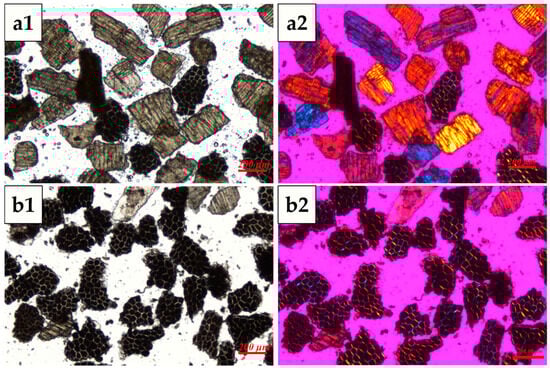 Microstructures of AL-rich and NAL-rich fractions obtained using tribo-electrostatic separation. (a) NAL-rich fraction, (b) AL-rich fraction. (a1,b1) were observed under an optical microscope; (a2,b2) were observed under a polarizing light of 530 nm.
