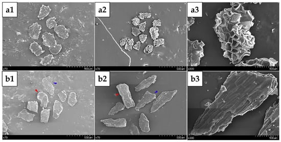 SEM micrographs of AL and NAL cell clusters before and after water extraction. (a1,b1) AL-rich fraction and NAL-rich fraction as-is; (a2,a3) residuals of AL-rich fraction after water extraction; (b2,b3) NAL-rich fraction after extraction, with magnified details. The red and blue arrows indicate the IN and OP fragments in the NAL-rich fraction, respectively.