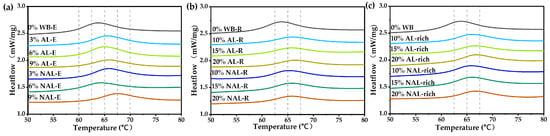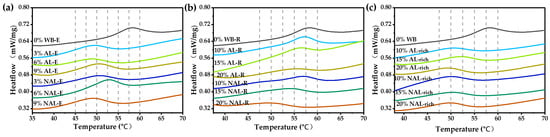 Influence of extracts and residuals from WB on the thermal properties of wheat gluten. (a–c) were thermal properties of gluten with varying contents of WB-E, WB-R, and WB layers, respectively. WB, wheat bran; AL, aleurone layer; NAL, non-aleurone layer; AL-E, extracts from AL-rich fraction; AL-R, residues of AL-rich fraction; NAL-E, extracts of NAL; NAL-R, residuals of NAL-rich fraction. 0–9% AL-E, dough made with gluten and 0–9% AL-E addition; 0–9% NAL-E, dough made with gluten and 0–9% NAL-E addition; 0–20% AL-R, dough made with gluten and 0–20% AL-R addition; 0–20% NAL-R, dough made with gluten and 0–20% NAL-R addition; 0–20% AL-rich dough made with gluten and 0–20% AL-rich fraction addition; 0–20% NAL dough made with gluten and 0–20% NAL-rich fraction addition.