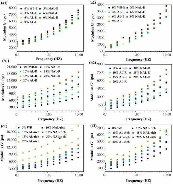 The influence of extracts and residues from WB layers on the dynamic rheological properties of wheat gluten. (a–c) were dynamic rheological profiles of gluten with varying contents of WB-E, WB-R, and WB layers, respectively. (1,2) storage modulus (G′) and loss modulus (G″) profiles, respectively. AL, aleurone layer; NAL, non-aleurone layer; AL-E, extracts from AL-rich fraction; AL-R, residues of AL-rich fraction; NAL-E, extracts of NAL; NAL-R, residuals of NAL-rich fraction.