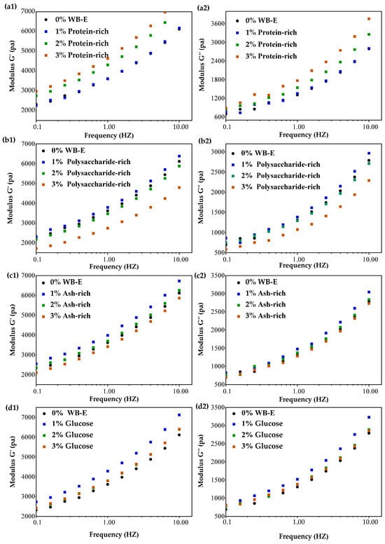 Influence of the major components in WB-E on the rheological properties of wheat gluten. (a–d) were dynamic rheological profiles of gluten with varying contents of protein-rich, polysaccharide-rich, ash-rich and glucose fractions, respectively. (1,2) storage modulus (G′) and loss modulus (G″) profiles, respectively. WB-E, wheat bran extract; 0–3% protein-rich dough made with wheat gluten and 0–3% protein-rich fraction. Similar meaning for the 0–3% polysaccharide-rich, ash-rich, and glucose fractions.