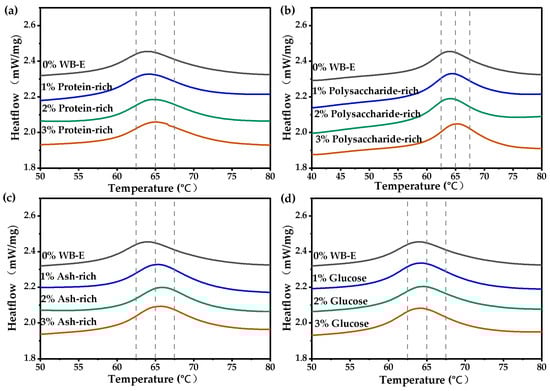 The influence of main components in WB-E on the thermal properties of wheat starch. WB-E, wheat bran extract. (a–d) were thermal properties of starch with varying contents of protein-rich, polysaccharide-rich, ash-rich and glucose fractions, respectively.