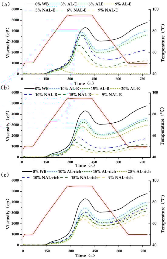 Influence of extracts and residuals from WB layers on the pasting property of wheat starch. (a–c) were pasting viscosity curves with varying contents of WB-E, WB-R, and WB layers, respectively.AL-rich, aleurone rich fraction; NAL-rich, non-aleurone layer rich fraction. AL-E extracts from AL-rich fraction; AL-R, residuals of AL-rich fraction after water extract; NAL-E, extracts of NAL; NAL-R, residuals of NAL-rich fraction after water extract. The red line in each graph represents the temperature profile, reflecting the programmed heating and cooling phases during the measurement.